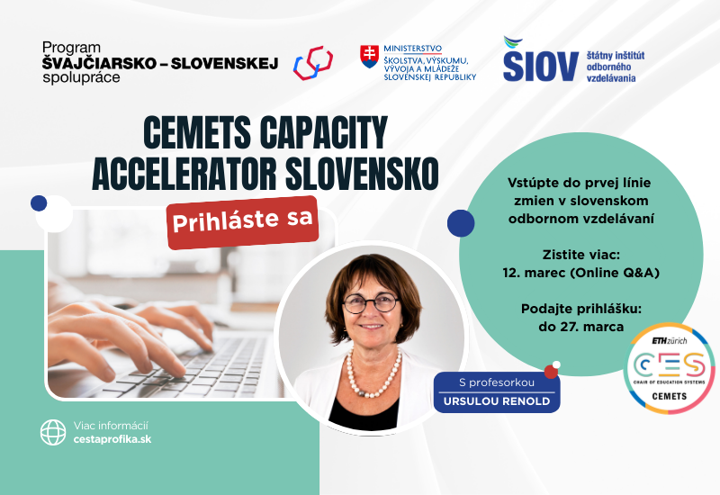 1. Pre expertov v oblasti odborného vzdelávania a prípravy je určený prestížny švajčiarsky online program CEMETS Capacity Accelerator zastrešovaný ETH Zurich. Program reaguje na aktuálne faktory, ktoré menia fungovanie podnikov, ako sú technologické inovácie, automatizácia, umelú inteligencia a pretrvávajúci nedostatok kvalifikovaných zamestnancov. Jeho cieľom je podporiť budovanie kapacít v oblasti odborného vzdelávania a prípravy.  Prihlásiť sa je možné od 3. do 27. marca 2026 prostredníctvom nasledovného odkazu: https://cestaprofika.sk/budovanie-kapacit/. Tu sú uvedené aj podrobnejšie informácie o zameraní a harmonograme tohto online programu.